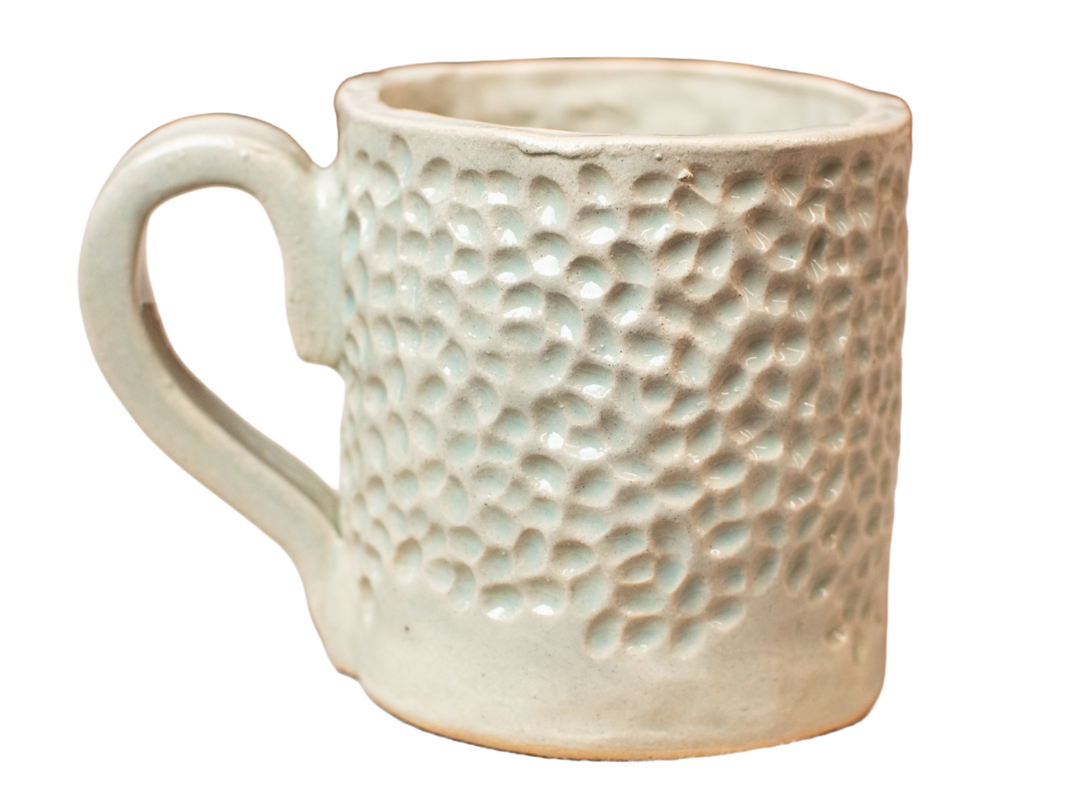 I throw these mugs on my pottery wheel, then indent and abstract wave pattern onto their sides. I finish them with a comfortable, sturdy handle and a silky smooth foot to protect your furniture.